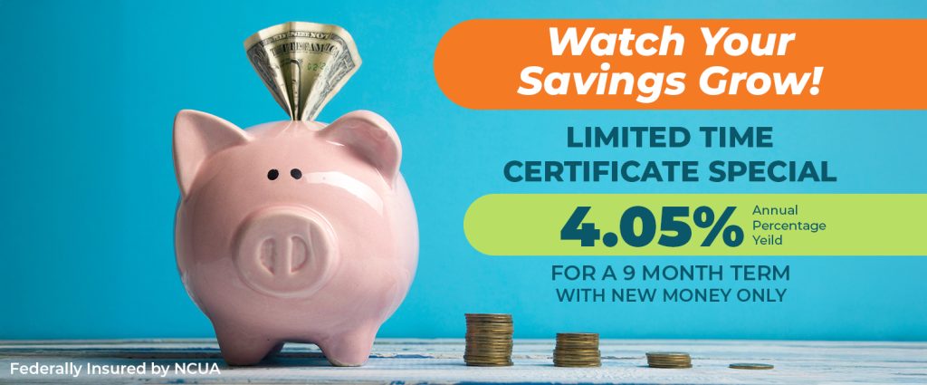 1) APY = Annual Percentage Yield. 9-month Certificate Promotional Rate is accurate as of May 19, 2025. MemberPLUS certificate rate bonus does not apply to this promotion. Promotion rate is available for a limited time and can be stopped at any time at the discretion of the Credit Union. The minimum balance required to qualify is $5,000. Fees or other conditions could reduce the earnings on the account. A penalty may be imposed for withdrawals before maturity. Please speak with a member services representative for information about applicable rates and fees. Other rates and terms are available.